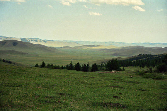 Départ pour une matinée de randonnée. La Mongolie n’est pas un pays d’éleveurs pour rien : la steppe est parsemée de crottin et de bouse séchées, ainsi que de laine de mouton. On trouve aussi un grand nombre d’os, restes de bétail mort de froid pendant l’hiver (un grand nombre de bêtes meurt durant les rigoureux hivers, où la température descend facilement à –40°C), ou tué par les éleveurs. Le ciel mongol est d’un bleu très pur, et même chargé de lourds nuages noirs, il subsiste toujours quelque part une parcelle d’un bleu éclatant. On comprend comment le Tengri a pu devenir une divinité.