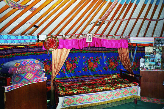 Nous faisons notre halte désormais habituelle, cette fois chez des Kazakhs. Par rapport aux yourtes précédemment visitées, celle dans laquelle nous sommes reçus est richement décorée, ce qui est caractéristique des habitations Kazakhs. Les murs sont recouverts de tapis de couleurs vives, le sol d’un tapis vert et d’une toile cirée colorée. Les perches du toit sont peintes de deux couleurs. S’il n’y a pas d’autel bouddhiste (les Kazakhs sont musulmans), il y a toujours les photos de famille. Pas de poêle, car, cet aïl comportant cinq yourtes, celle où nous nous trouvons sert uniquement aux réceptions et aux repas ; c’est dans une autre yourte (sur laquelle du fromage est mis à égoutter et à sécher) qu’est faite la cuisine. Sur les battants d’un meuble sont accrochées deux photos : une jeune femme asiatique faisant la publicité d’un dentifrice et... Estelle Halliday. Posé sur un meuble, un petit poste de radio portable diffuse en sourdine de la musique.