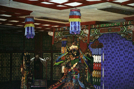 La dernière démonstration est un « tsam », une danse bouddhiste traditionnellement organisée pour chasser les démons et réjouir les divinités. Les danseurs sont munis de masques de la taille d’une tête humaine (mais ils sont parfois beaucoup plus grands). Les masques représentent des divinités et des animaux. Ici, un vieil homme chauve à la longue barbe blanche, le Vieillard Blanc, ouvre le spectacle ; il représente les esprits de la nature, la longévité et la bonté. Il est suivit de cerfs, de divinités aux visages rouges ou noirs ornés de têtes de mort, et de personnages humains. Les danses sont accompagnées d’une lumière stroboscopique et de cymbales et tambours représentant le tonnerre et les éclairs, ainsi que de trompettes qui évoquent des cris. L’effet est saisissant.