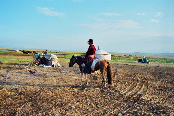 Un cavalier et l' « ourga », la perche munie d'un lasso permettant d'attraper les chevaux