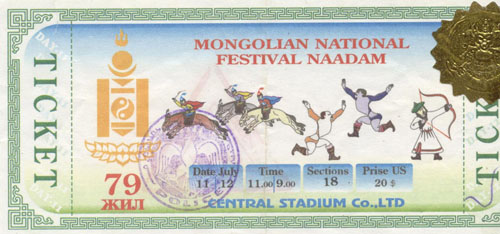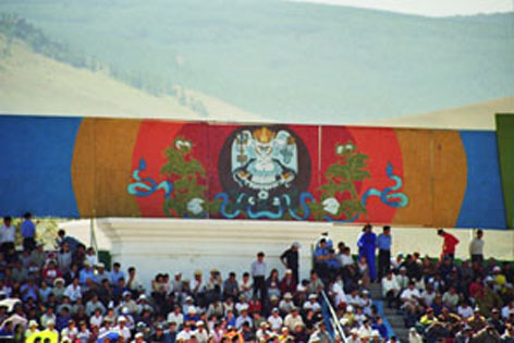A l’intérieur, le stade est comble : le Naadam est une fête nationale très suivie par les Mongols, relayée par la presse, la radio et la télévision. Les ombrelles se déploient dans les gradins situés en plein soleil. Face à nous, à l’autre extrémité du stade, figurent sur de grands panneaux le soyembo, emblème de la Mongolie, et une représentation de l’oiseau Garouda (rapace présentant des attributs humains. Il s’agit d’une créature de la mythologie indienne adoptée par le bouddhisme). Ce qui n’empêche pas le pourtour du stade d’arborer des panneaux publicitaires un peu plus profanes...