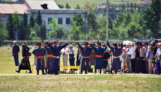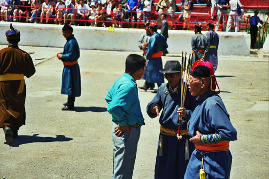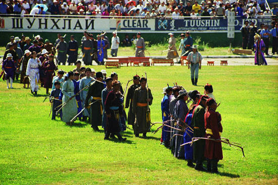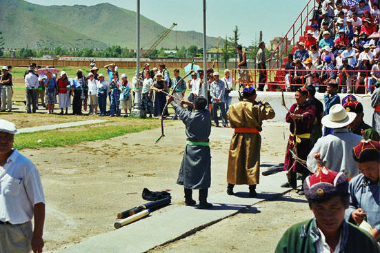 Les candidats au tir à l’arc (206 cette année) sont aussi bien des hommes que des femmes, de jeunes enfants que des vieillards. Ceux qui attendent leur tour bandent leur arc pour le tester, ils se saluent, discutent entre eux, tandis que les tireurs se concentrent et décochent leurs flèches. La cible est située à 75 mètres pour les hommes, 60 pour les femmes. Elle est constituée de cylindres de la taille d’un gobelet, empilés et alignés, et surmontée d’un fil rouge. Le but est d’atteindre ces cylindres ou de passer sous la ligne. Lorsque le tireur y parvient, les arbitres placés derrière la cible lèvent les bras et crient « Uukhaï ! » (« bravo », « bon tir »). Les hommes disposent de quarante flèches, les femmes de vingt flèches. Le vainqueur final reçoit le titre de « Mergen », c’est à dire habile tireur.