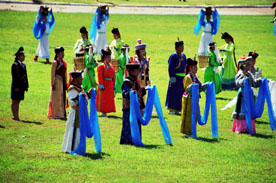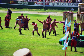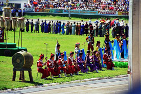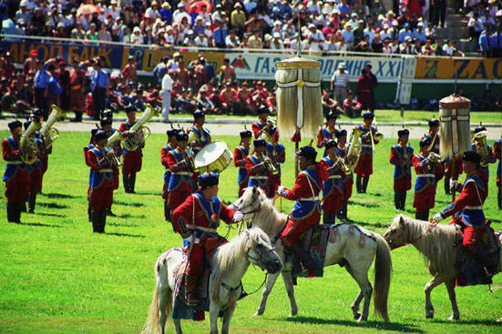 Le Président de la République, Bagabandi, vêtu du del, fait un discours. Par la suite, une dizaine de parachutistes atterriront les uns après les autres sur le stade. Après le discours, une dizaine de musiciens prennent place avec leur vielle-cheval (moriin khuur), une vielle mongole dont le chevillier est surmonté d’une tête de cheval sculptée. Plusieurs danses sont exécutées. Les danseuses portent dans leurs bras un khata, une pièce de tissu bleu omniprésente dans la vie spirituelle mongole, et dont il sera question plus loin, ou bien tiennent une courte fourche et portent un panier sur le dos : ce sont les deux instruments servant au ramassage de l’argol, c’est à dire la bouse séchée que les Mongols utilisent abondamment comme combustible (la steppe étant peu prodigue en combustible végétal). Ces danses sont suivies d’une chorégraphie moins traditionnelle : au son d’une musique plus ou moins techno, de jeunes garçons en del ou ancien uniforme de guerre exécutent une chorégraphie dynamique qui évoque volontier la break dance.