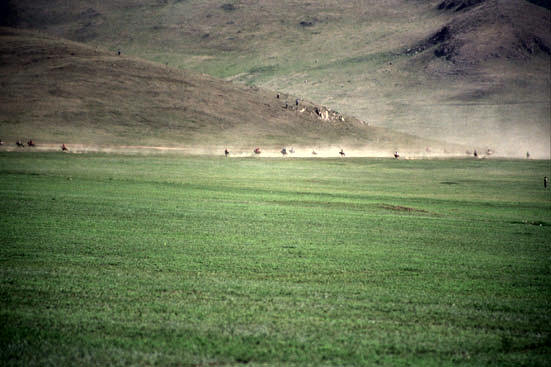 Au loin, un nuage de poussière signale l’arrivée imminente des chevaux ; on ne peut s’empêcher d’imaginer l’effet que devait produire, jadis, les dizaines de milliers de guerriers de Gengis Khan traversant la steppe au grand galop. Le peloton de tête passe devant nous, un peu trop loin pour que l’on puisse bien les voir, suivi du gros de la troupe. Certains chevaux ont perdu leur cavalier ; aucune importance, ces chevaux seront tout de même classés, car c’est le cheval qui importe, pas le cavalier. D’ailleurs, dans les interviews télévisées, ce sont les éleveurs qui seront interrogés, et non les cavaliers (ni les chevaux...).