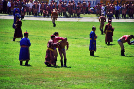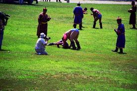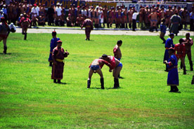 La lutte mongole est le sport populaire par exemple, un peu ce que le football peut être en Europe, sinon plus : les grands lutteurs sont célèbres, figurent sur des posters, des calendriers, des jeux de cartes ; les vainqueurs font la une des journaux, les Mongols font des paris sur les combats. Si les récompenses pour les cavaliers et pour les tireurs à l’arc sont assez modestes, celles des lutteurs sont plus conséquentes (1,5 millions de tugruts pour le premier, 1 million pour le deuxième. [En 2000, 1000 T valaient à peu près 1 $ US]). Les règles sont simples : la lutte se pratique à deux ; pour gagner, il faut faire toucher terre à l’adversaire autrement que par les pieds et les mains ; les coups sont interdits. Bien que, par la simplicité de ses règles, ce sport fasse penser de prime abord au sumo, il faut plutôt le rapprocher du judo (que certains lutteurs pratiquent par ailleurs). Contrairement au tir et à la course, la lutte est un sport strictement masculin et n’oppose que des adultes.