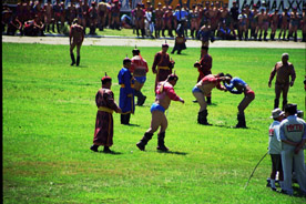La cérémonie d’ouverture du Naadam débute sous l’œil vigilant de quelques milans qui survolent le stade. Les archers de tous âges (les plus jeunes ont six ou sept ans), vêtus du del (costume traditionnel mongol dont il sera question plus loin) défilent, l’arc à la main, et s’alignent en deux rangs de part et d’autre du stade. Deux jeunes garçons vêtus d’un uniforme de guerre de l’époque gengis-khanide viennent prendre place devant deux grands tambours. C’est au tour de la fanfare, en uniforme bleu et rouge (je n’ai pas pu apprendre l’origine de ce costume) d’avancer. Au fond, les lutteurs s’alignent.