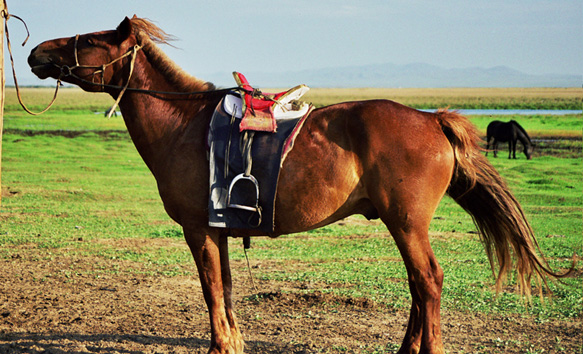 Entre deux rangées de yourtes circulent piétons et cavaliers. De loin en loin retentit un « Tchou ! Tchou ! », le son par lequel les cavaliers ordonnent à leurs chevaux d’avancer. Assis ou allongés à l’ombre d’une tente, certains se reposent, discutent nonchalamment. Il règne la même ambiance de kermesse populaire que j’ai ressentie à la sortie du stade. C’est également dans ce campement que les Mongols feront la fête, le soir venu – et ne lésineront pas, paraît-il, sur l’alcool... Cette petite promenade fournit l’occasion d’admirer les selles mongoles. Surélevées par rapport aux selles européennes, elles sont en bois, peintes de couleurs vives, souvent décorées de cabochons d’argent (parfois, la bride est aussi ornée de petites pièces d’argent). Les étriers sont courts : en fait, le cavalier mongol se tient le plus souvent debout sur ses étriers ; lorsqu’il est assis, il se penche d’un côté puis de l’autre ; au repos, il quitte parfois la selle pour s’asseoir derrière, confortablement accoudé sur son cheval.
