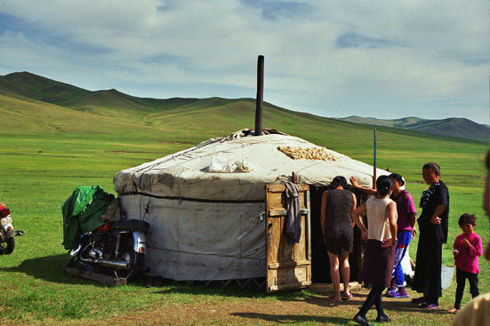 Nous sommes accueillis par le père de famille et ses enfants. Cette famille possède également une moto (ce qui n’est pas rare) et une voiture (ce qui l’est un peu plus). Pour la première fois, mais certainement pas la dernière, on nous sert de l’aïrak. Le propriétaire nous montre fièrement la belle peau de loup (ces animaux sont très nombreux dans le pays) qui lui a été donnée, et qui servira à confectionner des vêtements chauds pour l’hiver.