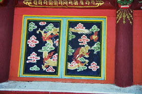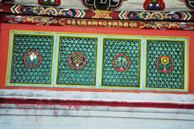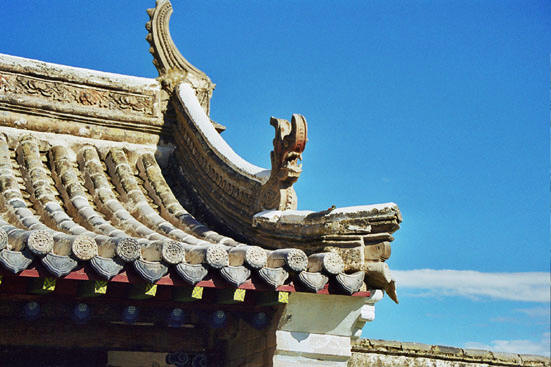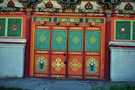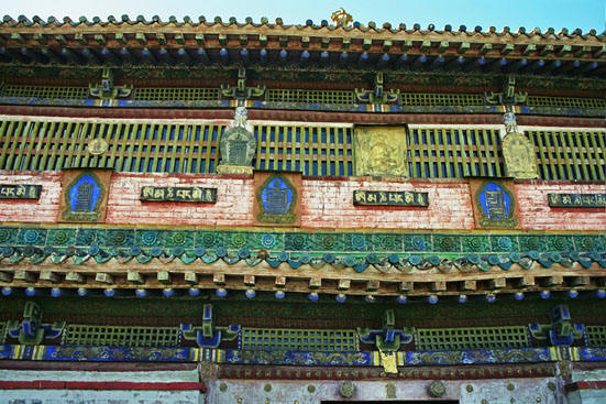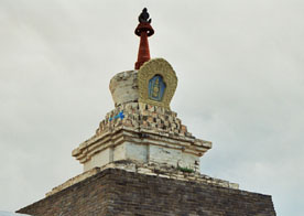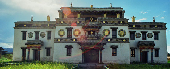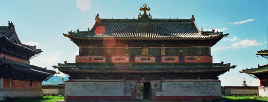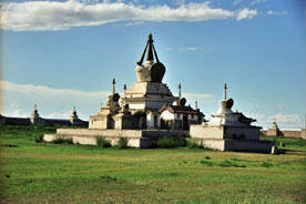 Par contre, il y a près de Karakorum le monastère d’Erdene Zuu. Fondé à partir 16ème siècle, d’une surface de 400 par 400 mètres, il s’agit de l’un des plus anciens et plus importants monastères du pays. Les nombreux temples de style chinois (plus un de style tibétain) qu’il abrite sont entourés d’une muraille surmontée de 108 stupas – tourelles surmontées du symbole cosmique feu-lune-soleil que l’on retrouve dans le soyembo. Chaque stupa a été édifié en relation à un événement ou un lama particulier. Certains renferment les restes momifiés de lamas importants. Ce nombre 108 n’est pas fortuit : il s’agit de (1) x (2 x 2) x (3 x 3 x 3).