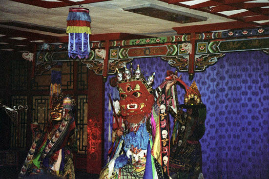 La dernière démonstration est un « tsam », une danse bouddhiste traditionnellement organisée pour chasser les démons et réjouir les divinités. Les danseurs sont munis de masques de la taille d’une tête humaine (mais ils sont parfois beaucoup plus grands). Les masques représentent des divinités et des animaux. Ici, un vieil homme chauve à la longue barbe blanche, le Vieillard Blanc, ouvre le spectacle ; il représente les esprits de la nature, la longévité et la bonté. Il est suivit de cerfs, de divinités aux visages rouges ou noirs ornés de têtes de mort, et de personnages humains. Les danses sont accompagnées d’une lumière stroboscopique et de cymbales et tambours représentant le tonnerre et les éclairs, ainsi que de trompettes qui évoquent des cris. L’effet est saisissant.